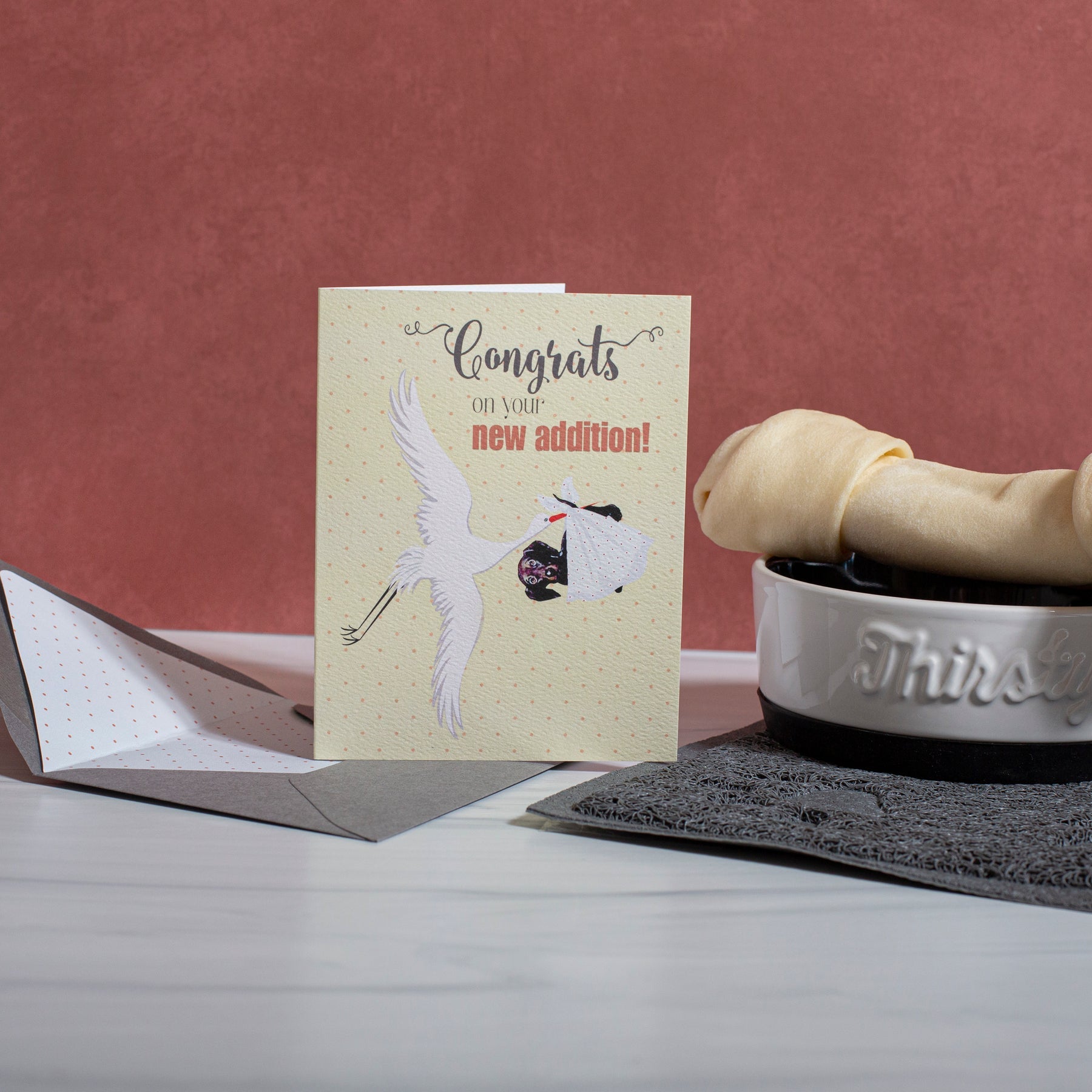 Welcome a new furry friend with this vintage stork "Congrats on your new addition" greeting card! Showcase your heartfelt sentiments with the nostalgic design and envelope liner for a touch of elegance and keepsake memories.