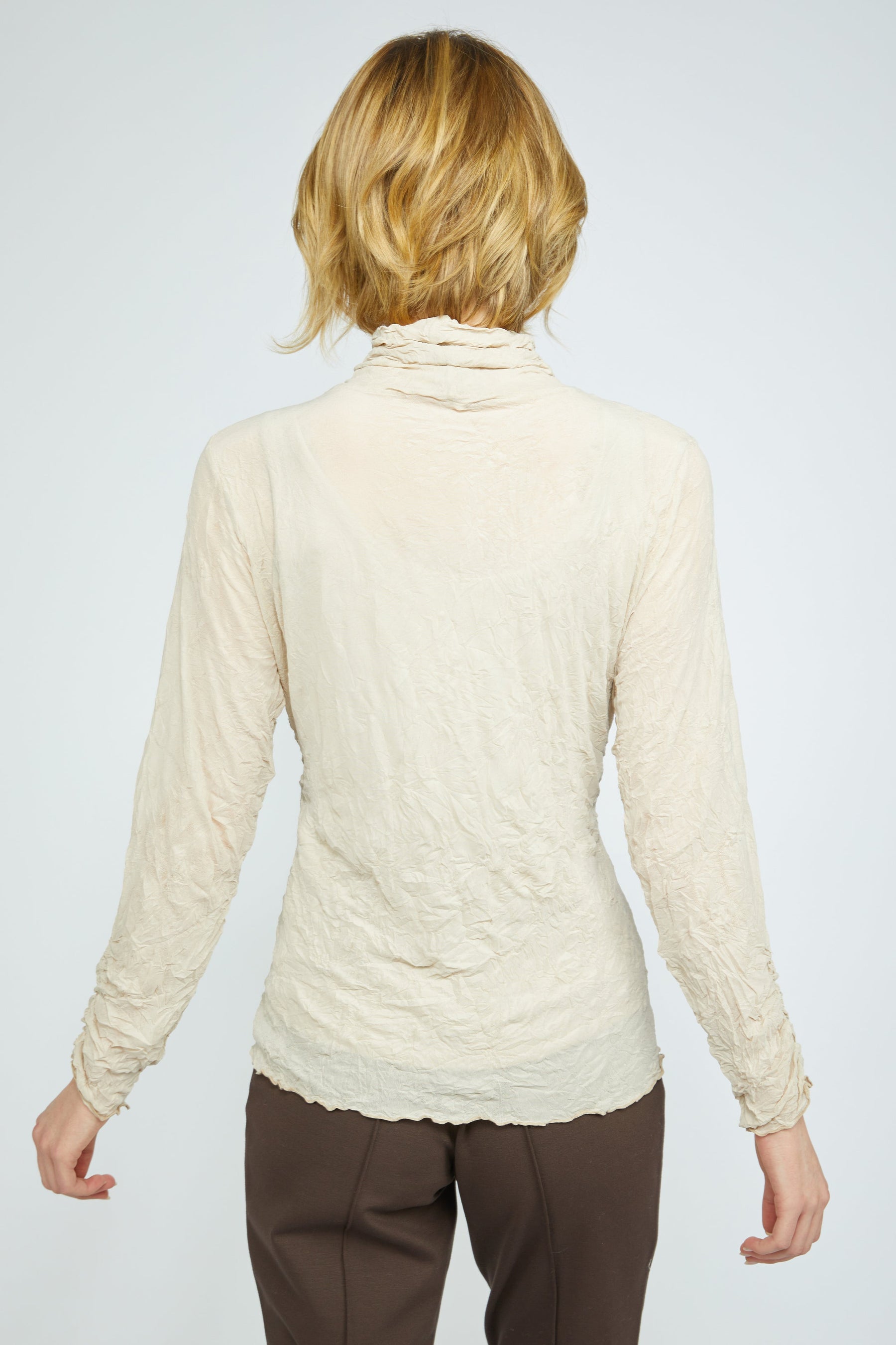 Ruched turtle and sleeves for a feminine finish. 5% Spandex maintains fabric shape. Tank layer recommended (not included).