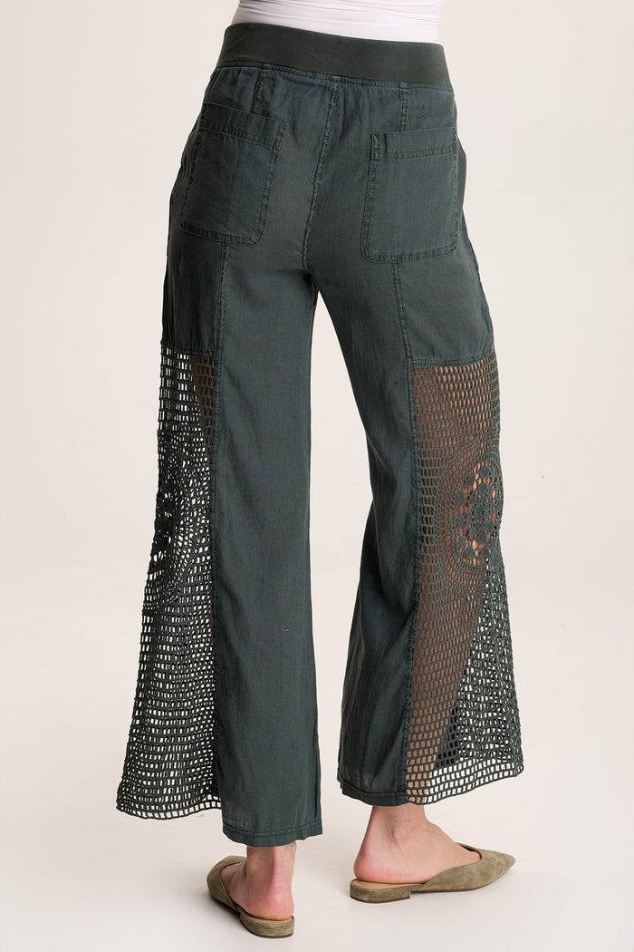 A linen pull-on waist wide leg with a circular design crochet leg panels and including front and back pockets makes up Tangent Pant.