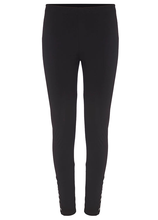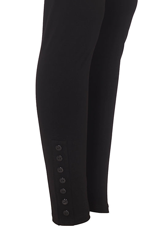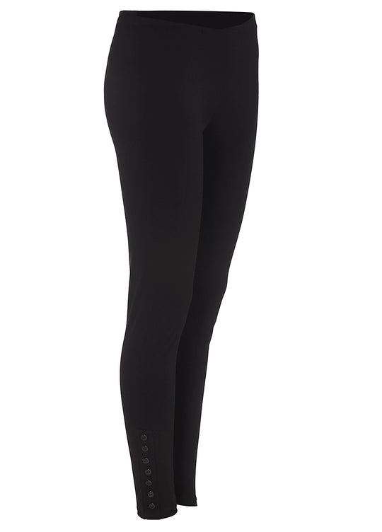 The Della Legging is seasonless and soft. This legging has an elastic waistband and a narrow leg with a stylish button detail. Full length legging done in a super soft and smooth jersey fabric. Perfect for layering with your favorite tunic or sweater.