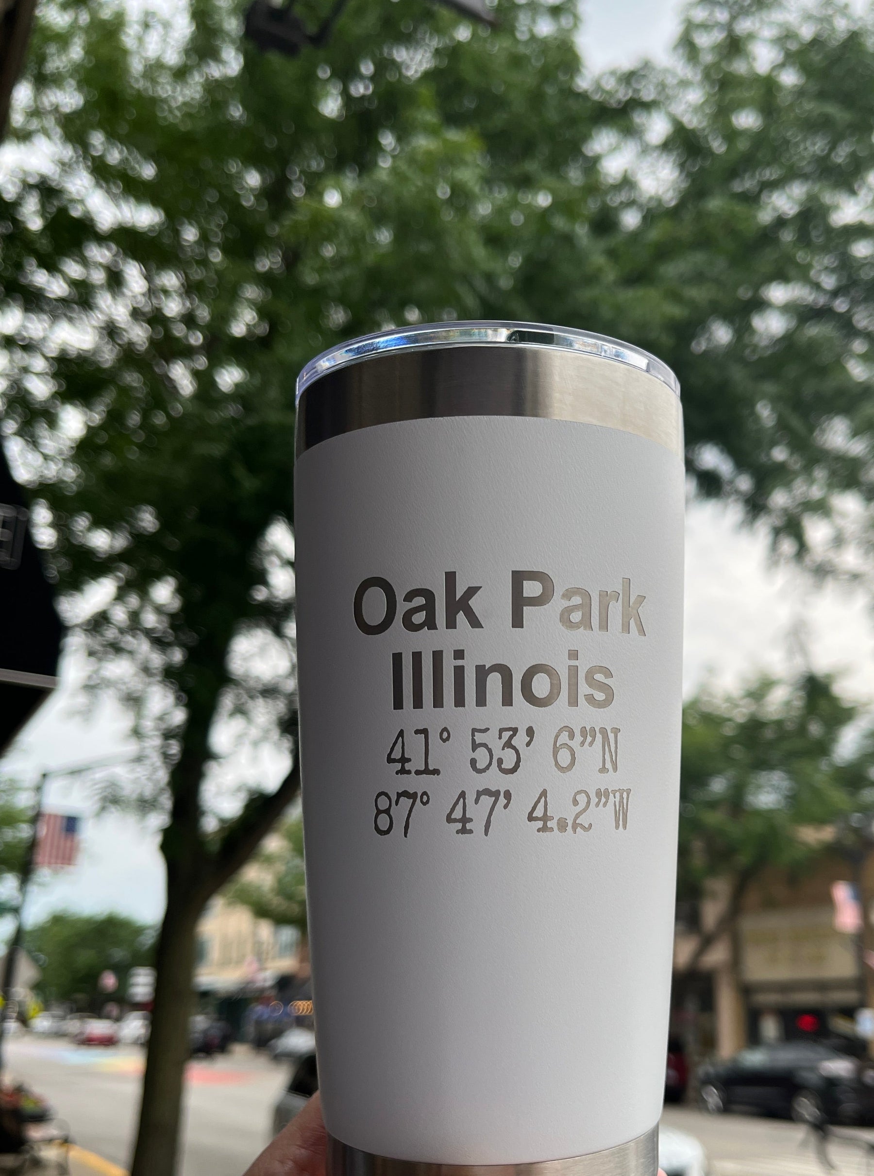 Engraved tumbler with a durable powder coated color. All tumblers are engraved to insure the writing will never peel or fade. This tumbler comes with the phrase "Oak Park Illinois 41 53' 6" N. 87 47' 4.2"W".