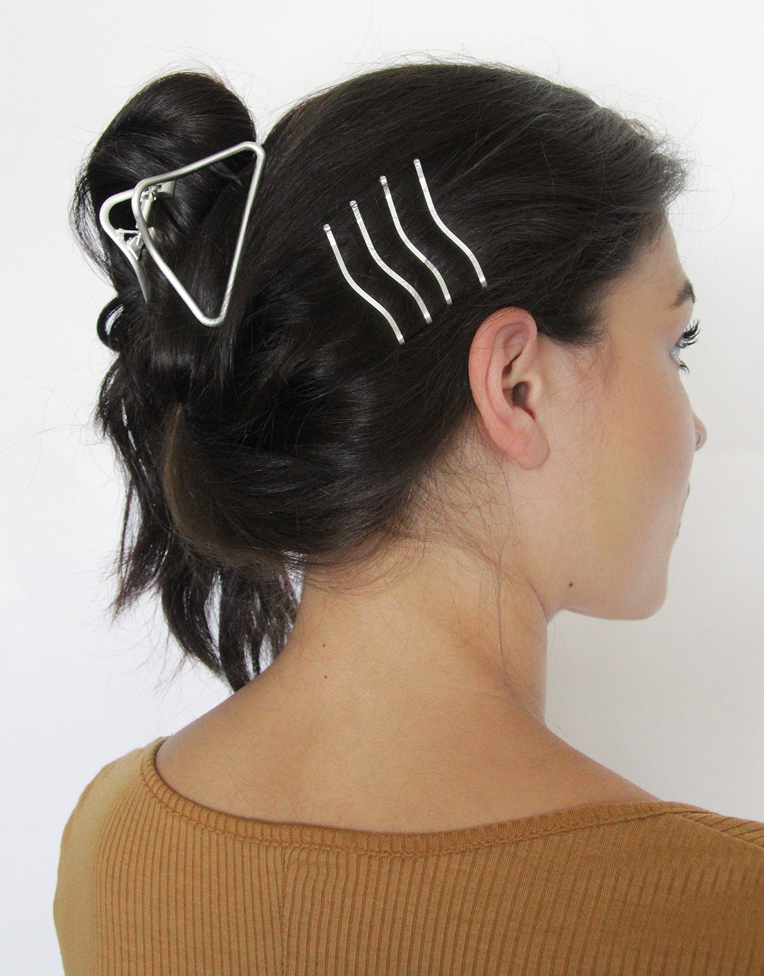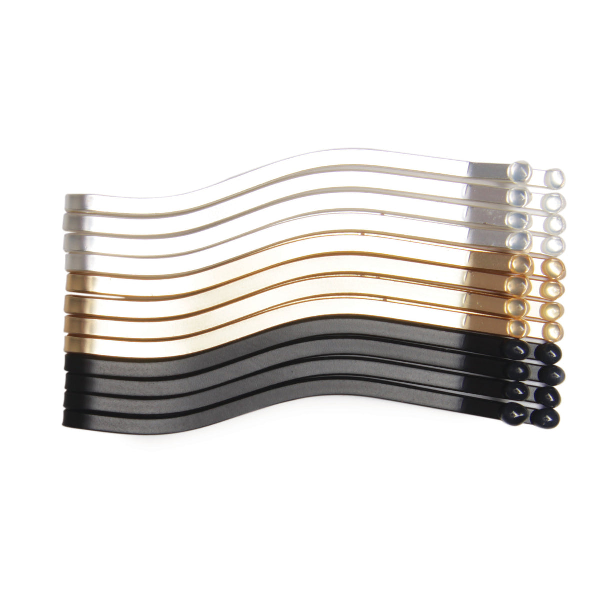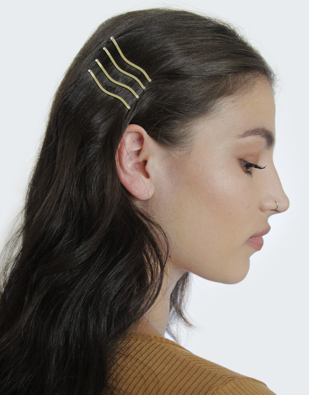 - Unique wavy bobby pin shape in matte silver, matte gold and matte black
