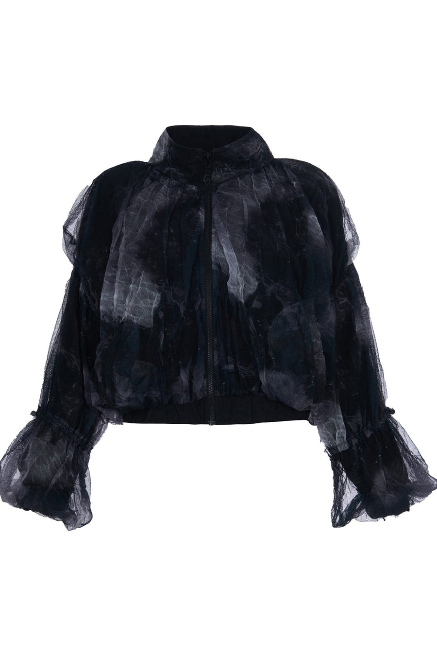 Express your attitude in this anything but traditional jacket. A sheer mesh overlay encapsulates a cropped bomber style jacket with a crisp nylon windbreaker feel. It zips in front with a gathered hemline and draw cords on the sleeves that create a puffed effect when cinched.