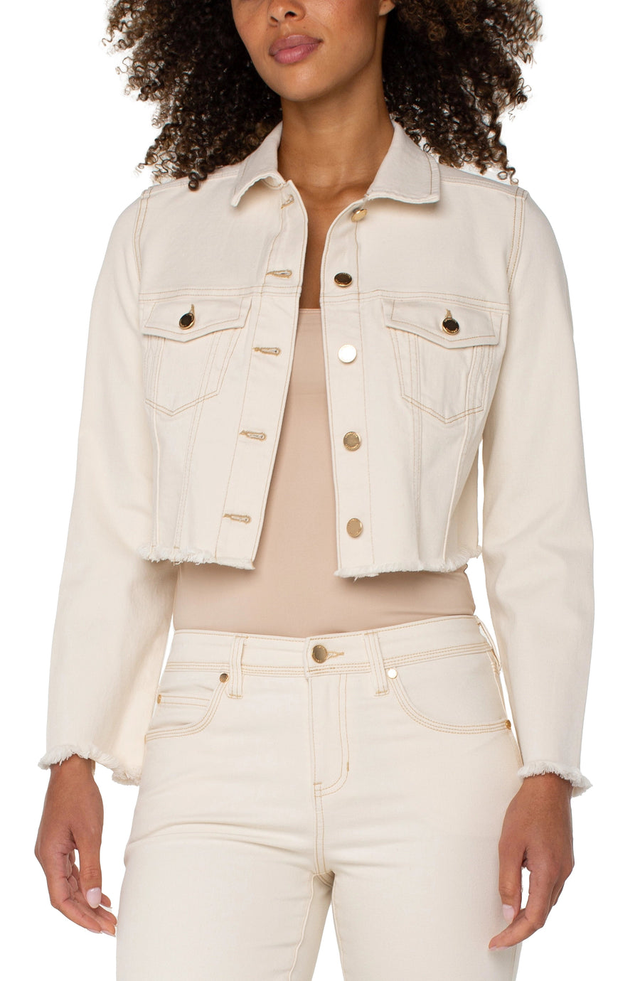 Designed with a relaxed, yet stylish silhouette, this jacket in Seaside Dunes color features a unique frayed hem for a touch of laid-back edge. The soft, neutral tone adds versatility to your wardrobe, while the frayed detailing gives it an effortlessly cool, worn-in look.
