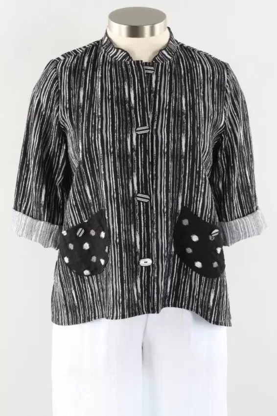The Mandarin Collar Jacket is a part of Habitat's Express Travel collection. It has a suitcase ready crinkled texture and a lightweight feel. The short stand up collar leads to a novelty button front with long sleeves and button close front pockets. A horizontal seam below the shoulders in back introduces a box pleat that adds to a beautiful drape. A versatile wardrobe extender that easily transitions from work to weekends.