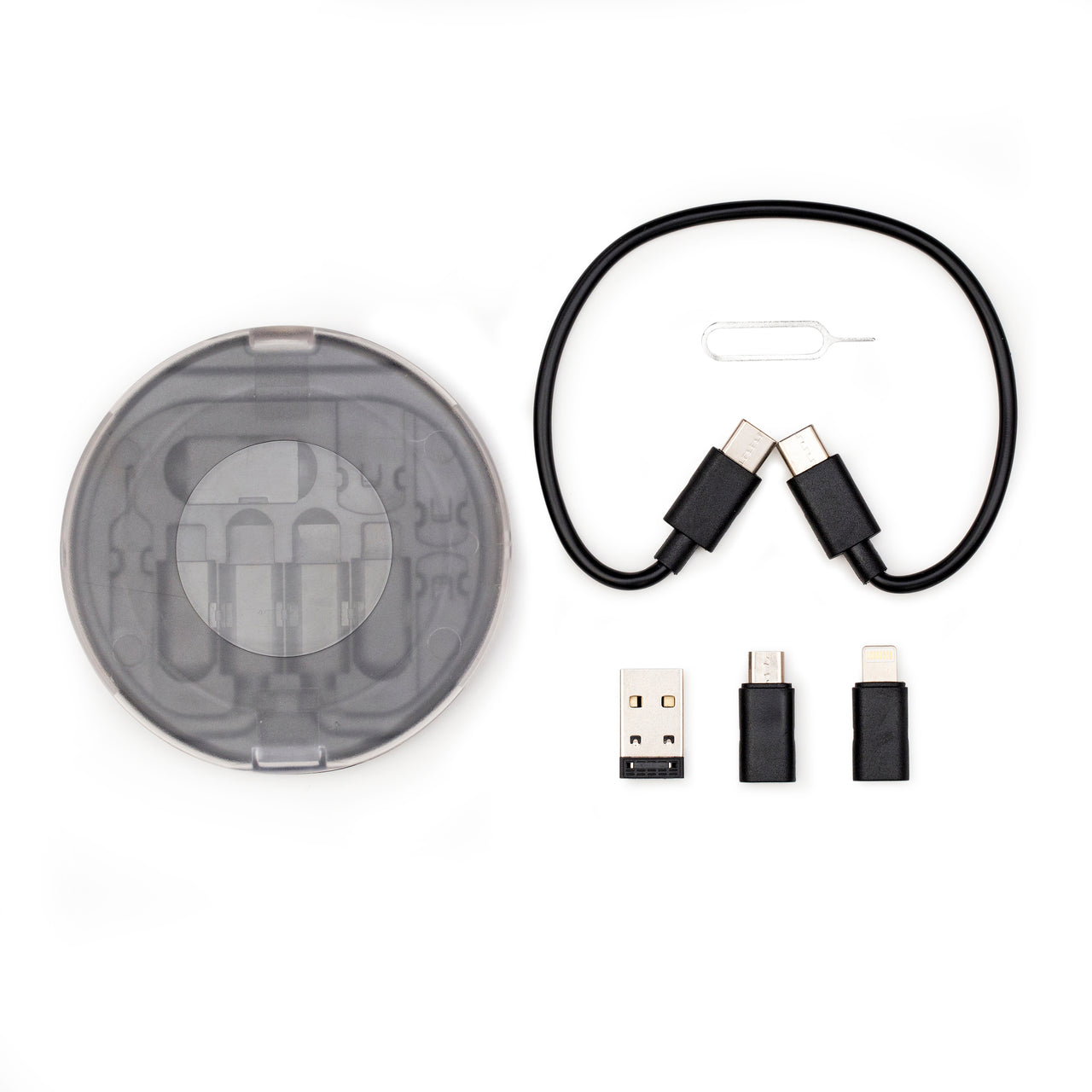 Charge all your devices on the go! Includes USB to Lightning, USB to micro-USB, USB to type C, type C to micro-USB, type C to type C, type C to Lightning, SIM card removal pin, micro SIM card storage/Micro SD, and 2 slots for nano SIM cards. All of that and a phone stand, all within a handy travel case. Compatible with all smartphones.